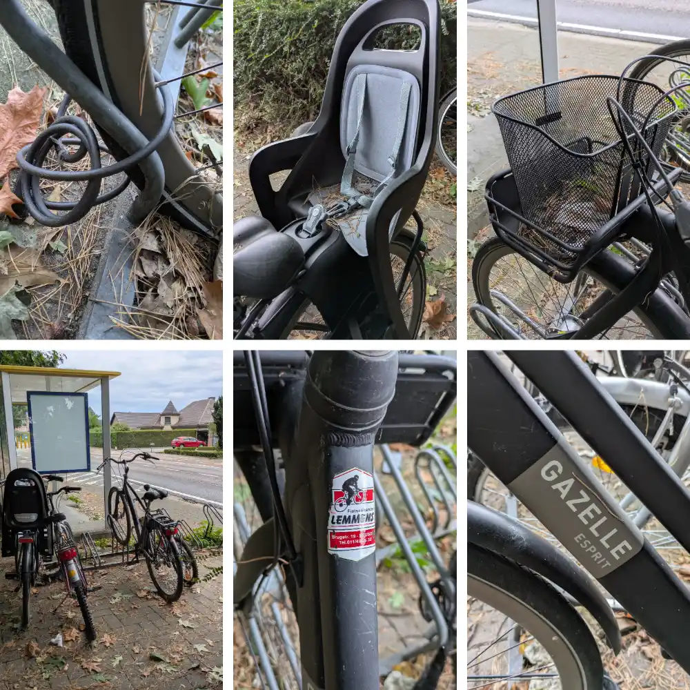 | 0037 | 58820 | Gazelle Esprit | ![]() | Open googlemaps | Geen Weesfiets | 13-sep-25 | 20-sep-25 | 16-okt-25 | fietsenstalling bij de bushalte langs de Beringersteenweg, vlak bij de rotonde Kapelstraat/Everselkiezel. | 16/10/25: mail naar TW dat de fiets niet op locatie staat. | 15/10/2025 - 08.10 (Lotte Troosters) : stand van zaken politie opgevraagd 24/09/2025 - 15.53 (Lotte Troosters) : politie laat weten dat ze de fiets nog niet gaan labelen > in goede staat en afgesloten, ze houden ons op de hoogte 22/09/2025 - 08.04 (Lotte Troosters) : doorgestuurd naar wijkagent om te labelen / foto's in bijlage | Merk: Gazelle Esprit Kinderstoel achterop, Mandje vooraan, Lijkt technisch in orde, Vastgemaakt met dun kabelslot aan stalling, Eerste vaststelling 13/09/25, Staat al een week onaangeroerd aan de fietsenstalling bij de bushalte langs de Beringersteenweg, vlak bij de rotonde Kapelstraat/Everselkiezel. | ![]() |