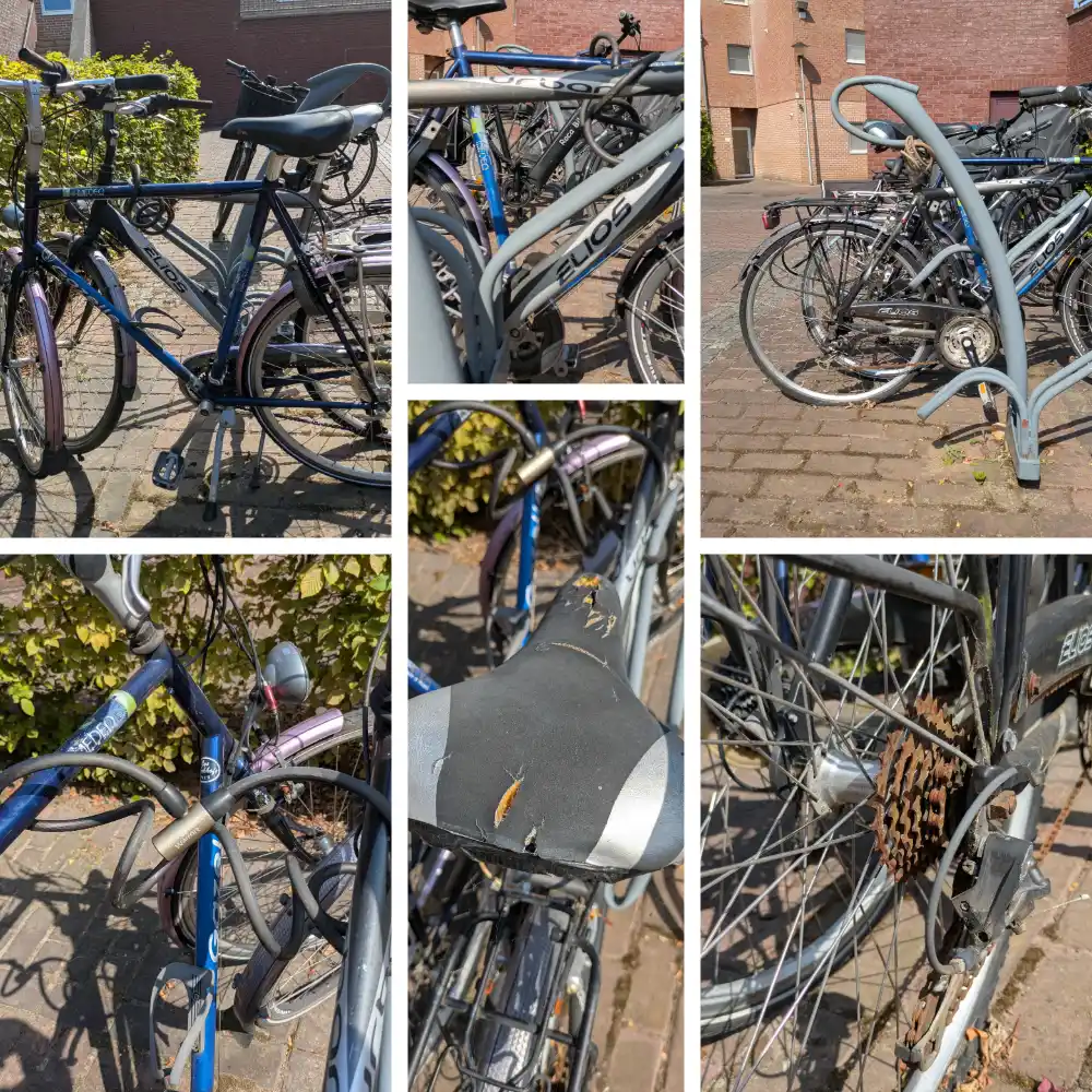 | 0012 | 58516 | Elios | ![]() | Open googlemaps | Geen Weesfiets | 13-aug-25 | 07-sep-25 | Wendelenhof, tussen Dorpsstraat en Inakker | 17/09/25: fiets is weggehaald langs de Inakker. 16/09/25: fiets staat nu langs de inakker met een "gratis op te halen" blad, de gazelle fiets waar deze fiets aan bevestigd was staat terug in de fietsbeugel maar nu zonder label 12/09/25: geconstateerd dat de fiets niet meer op locatie aanwezig is. Deze was met een kabelslot bevestigd aan een tweede fiets (Gazelle), die nog wel aanwezig is. Deze Gazelle fiets was eerder niet gemeld, maar is wel gelabeld en staat nu tegen de haad naast de fietsbeugel. | 22/09/2025 - 08.11 (Lotte Troosters) : melder laat weten dat de fiets ondertussen door eigenaar werd opgehaald 09/09/2025 - 07.24 (Lotte Troosters) : gelabeld door wijkagent, ophalen vanaf 19/09 08/09/2025 - 08.24 (Lotte Troosters) : doorgegeven aan wijkagent om te labelen / foto's in bijlage 09/09/2025 - 07.24 (Lotte Troosters) : gelabeld door wijkagent, ophalen vanaf 19/09 08/09/2025 - 08.24 (Lotte Troosters) : doorgegeven aan wijkagent om te labelen / foto's in bijlage | Merk: Elios Urban Verroeste ketting, remmen volledig vastgeroest, Beide banden plat, Zadel beschadigd, geen frameslot, Fiets is aan een tweede fiets (Gazelle) bevestigd met een kabelslot rond de fietsbeugel, Gazelle fiets is in goede staat. Wendelenhof, tussen Dorpsstraat en Inakker | ![]() | |