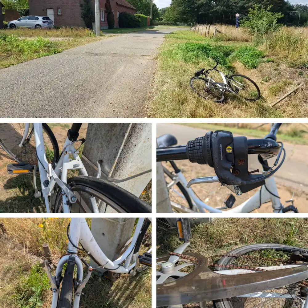| 0022 | 58165 | Merkloos | ![]() | Open googlemaps | Geen Weesfiets | 19-aug-25 | 21-aug-25 | Gevonden in de gracht in de Schansstraat (fietspad, Muitenberg, aan het huis Vanhamel nabij kruising Trampad). Fiets staat momenteel tegen de elektriciteitspaal Schansstraat-Trampad. | 11/09/25: mail naar TW met melding dat de fiets door iemand is opgehaald, staat niet meer op locatie. 07/09/25: fiets is nog steeds niet gelabeld. | 11/09/2025 - 13.51 (Lotte Troosters) : melder laat weten dat de fiets weg is 25/08/2025 - 09.26 (Lotte Troosters) : foto's in bijlage / doorgestuurd naar politie om te laten labelen | Merk: Merkloos Is een fietswrak, zou best onmiddellijk verwijderd worden. Remmen werken niet meer, Achterband plat, Ketting verroest, zit niet meer op de tandwielen, Geen voor- of achterlicht